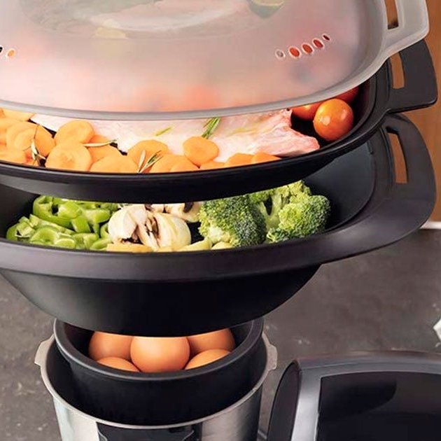 Además, también encontrarás un cesto para hervir. Y gracias a ella podrás preparar hasta cuatro elaboraciones a la vez: en la jarra, en el cestillo y en los dos niveles de la vaporera.