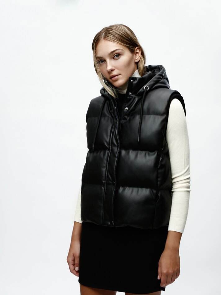 La cadena de moda Lefties, consciente de que determinadas sensibilidades ganan en el sector de moda espacio cada día, nos presenta un chaleco acolchado en el que la piel auténtica se sustituye por una mezcla de políester y poliuretano que genera un efecto más que realista. Se cierra con cremallera y botones a presión. Incluye capucha y está disponible en dos colores: negro y blanco.
