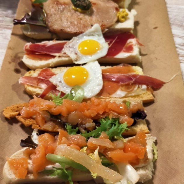 - Surtido de tostas: Jamón y huevo de codorniz, lomito con mahonesa de curry, ahumado con mahonesa de jengibre y soja