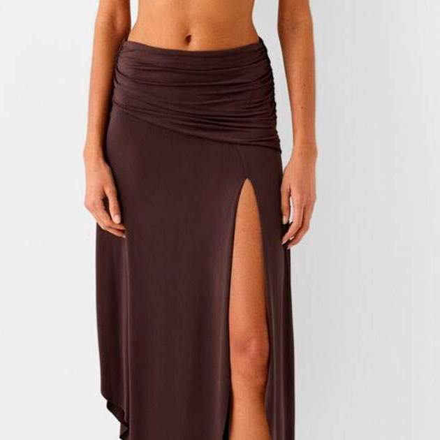 Fabricada en un color marrón oscuro, la falda de Bershka presenta un diseño minimalista que resalta por su sencillez y elegancia. La estructura de la cintura vuelta no solo añade un detalle único sino que también asegura un ajuste cómodo y favorecedor. Esta característica, combinada con el largo midi, hace que la falda sea una elección ideal para quienes buscan una pieza que equilibre estilo y comodidad.