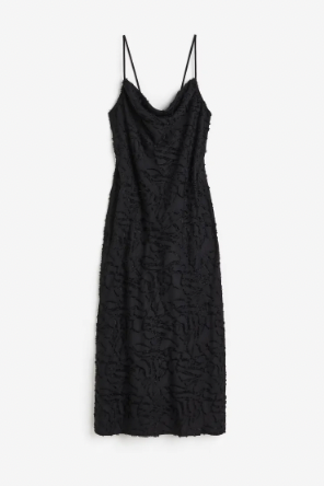 El tejido con textura sin duda es el toque final de este diseño, con acabado liso en el fondo y líneas de acabado en relieve y brillante que es todo un encanto y que le aporta ese toque de vestido de lujo que no hemos visto en otra parte. Como si el tejido con textura no fuera suficiente, este vestido además cuenta con un forro desde el cuello hasta el bajo, lo que le permite amoldarse con mayor estilo en la figura y creando un efecto ajustado para que resaltes a donde quiera que vayas. Es de lo más buscado ahora mismo en H&M y está disponible en color negro, siendo uno de esos vestidos que vas a poder combinar con zapatos de tacón o sandalias en diferentes tonos y que siempre será un acierto.