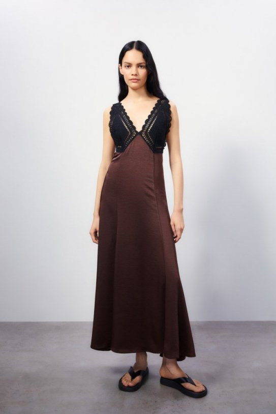 La combinación del tejido crochet en negro con la falda marrón, hacen de este un vestido que se adapta a todos los estilos y salidas, pudiendo combinarlo con diferentes tipos de calzado y siendo un acierto con cualquier accesorio que decidas utilizarlo.