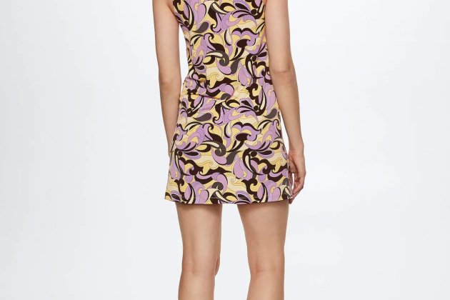 Este vestido de Mango ha sido confeccionado en un estampado que combina colores atemporales que no pasan de moda y son siempre un acierto, como es el caso de amarillo y morado pastel, en contraste con negro.