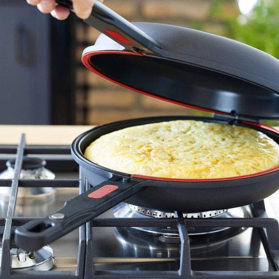 ¿Y si hablamos de darle la vuelta, qué me dices cuando se engancha? Olvídate. Gracias a su revestimiento antiadherente libre de PFOA, la distribución del calor es tan equitativa que tus alimentos jamás se pegarán. Y lo que realmente la convierte en la estrella de la cocina es su sistema de cierre: dos sartenes que se unen herméticamente con un imán en el mango, creando un efecto horno que asegura tortillas perfectas y sin derrames al darles la vuelta.