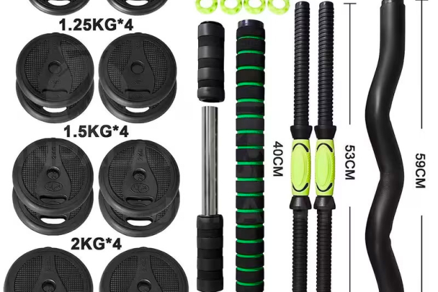 El juego de mancuernas 4 en 1 Multifit de Decathlon es una excelente opción para quienes buscan un equipo de entrenamiento de fuerza versátil y asequible. Este juego incluye dos barras de mancuerna de 53 cm de largo cada una, 16 discos, cuatro de 1,25 kg (diámetro de 17,5 cm y espesor de 3,2 cm), cuatro de 1,5 kg (diámetro de 18 cm y espesor de 3,5 cm), cuatro discos de 2 kg (diámetro de 19 cm y espesor de 3,8 cm) y cuatro discos de 2,5 kg (diámetro de 21 cm y espesor de 4 cm); dando un total de 30 kg.