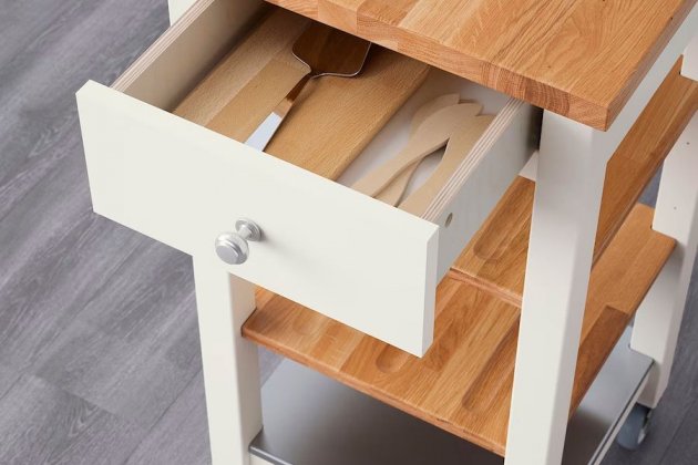 Este es el carrito auxiliar de Ikea que se adapta a todas las cocinas y además resulta multiusos porque vas a poder sacarle un montón de provecho. Su diseño es de varios niveles, con una tabla para trabajo en la parte superior y que se acopla a todas las paredes y esquinas con facilidad.