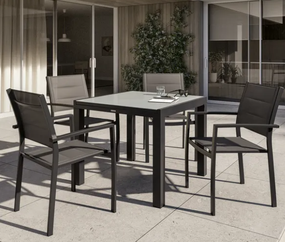 La estructura de la mesa es de aluminio, lo que reduce el peso y la bandeja (también la extensible) de cristal. Las patas son regulables para compensar eventuales irregularidades del suelo y el aluminio es, además, resistente a la oxidación y a las inclemencias del tiempo. Cuesta 229,04 euros gracias al descuento que Leroy Merlin ofrece hasta primeros de agosto. Se recomienda combinarla con sillas o sillones de la gama Naterial Orion II.