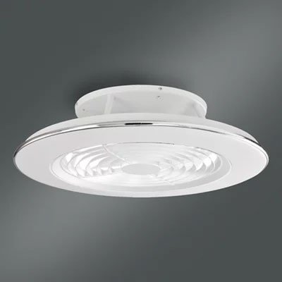 Este ventilador de Alisio a la venta en Leroy Merlin tiene unas medidas de 62,7 x 16,6 cm, y está recomendado para habitaciones de unos 20 metros cuadrados. Luce con una estructura de color blanco con detalles cromados fabricada en ABS. Y en su interior monta 7 aspas en color transparente. Y su motor DC permite distintas velocidades.