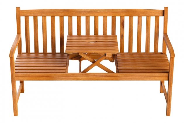 Se trata de un banco de Lidl que cuenta con dos o tres plazas según como quieras usarlo, pues en medio cuenta con una tabla plegable que se eleva para ofrecer una mesa estable donde podrás ubicar vasos, copas, platos de comida y mucho más.