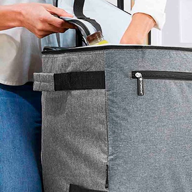 Además, este carrito cuenta con un compartimento aislado para que puedas mantener los productos separados y bien organizados. Y también con un compartimento frontal con cremallera para otros objetos como las llaves de casa o bolsas extra.