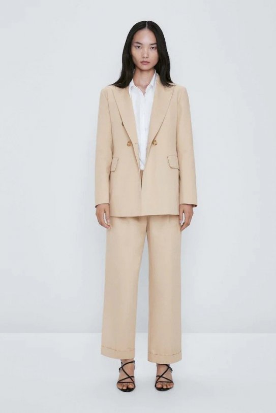 Como era de esperarse en Massimo Dutti, además de encontrar disponible este pantalón de lujo, también puedes echarle un vistazo a la americana beige que hace el match perfecto, pues está confeccionada con los mismo materiales y en el mismo tono beige si quieres llevar el traje completo.