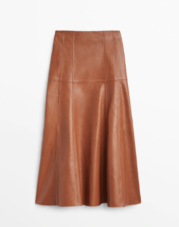 El corte evasé crea un efecto de ondas grandes y definidas en el bajo que aportan máxima elegancia y movimiento, siendo además una de esas faldas que puedes llevar con botines, botas de caña alta o tus sandalias favoritas y siempre será un acierto. Al estar confeccionada en piel ovina, las costuras lucen mucho más delicadas y de lujo, realzando el estilo y convirtiéndola en una falda difícil de ignorar. Al mismo tiempo, tiene un acabado brillante y liso que nunca pasa desapercibido en las prendas de piel. El color cuero es el elegido por Massimo Dutti para esta falda, y no tenemos dudas de que han acertado completamente, pues además de ser atemporal, es de esos diseños que vas a poder combinar con infinidad de colores y prendas. Hasta el momento no hemos visto otro color para este modelo en particular.