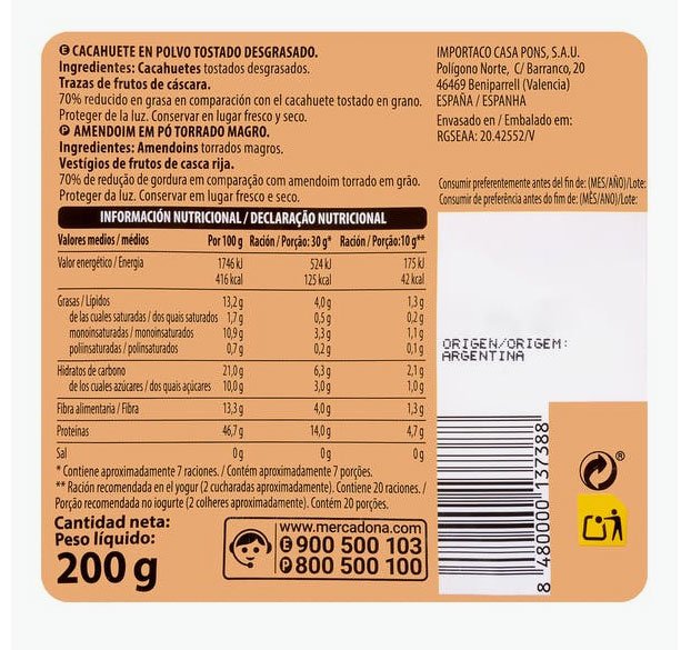 Este cacahuete en polvo lo envasa Hacendado, una de las marcas blancas habituales de Mercadona. Y está elaborado por Importaco Casa Pons, una empresa afincada en Beniparell, Valencia. Como te hemos dicho, viene en envases de 200 gramos. Y cada uno de ellos cuesta 3 euros, estando disponible tanto en las tiendas físicas de Mercadona como en su página web.