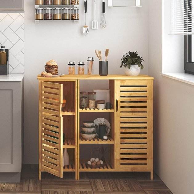 El buffet SogesHome está fabricado con bambú natural, lo que le otorga un aspecto elegante y un tacto suave al mismo tiempo que garantiza una durabilidad inigualable. Su color bambú natural aporta un toque de calidez a cualquier espacio, lo que lo hace adecuado para una variedad de estilos de decoración.