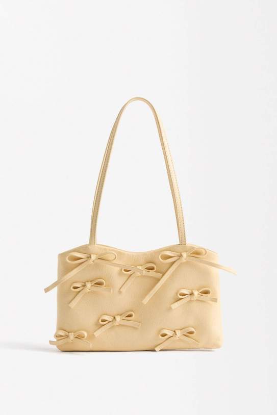 El bolso de hombro con lazos de Parfois está confeccionado con un acabado sintético que emula a la perfección la textura del cuero, ofreciendo un estilo sofisticado y fácil de mantener. Su diseño se centra en los detalles: pequeños lazos decorativos recorren su superficie, añadiendo un aire femenino y elegante.