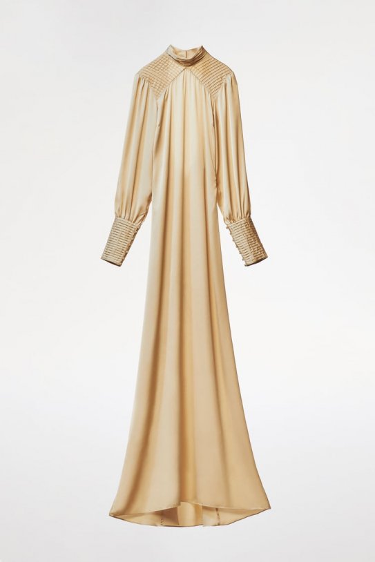 Entre todos los vestidos que la colección ofrece hay uno que llama especialmente la atención. Se trata de un largo de cuello subido y manga larga con abertura en la espalda de color champagne. Mientras que en los puños y en los hombros cuenta con unos detalles y pliegues.