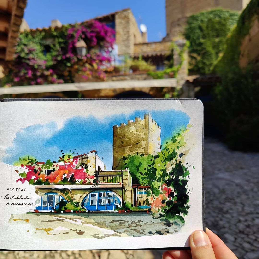 Una mochila con un taburete, un bloc, lápiz y acuarelas es lo que lleva arriba y abajo cuando viaja Alicia Aradilla. Esta artista extremeña de 32 años pinta en vivo e inmortaliza paisajes de todo el mundo. Y realmente, también nos lleva a todos dentro de la mochila, porque con sus acuarelas nos lleva de viaje allí donde va. Este verano ha captado una de las zonas más bonitas de Catalunya (perdonad la imparcialidad gerundense): ha recorrido la Costa Brava y el interior de Girona pintando sus impresionantes paisajes.