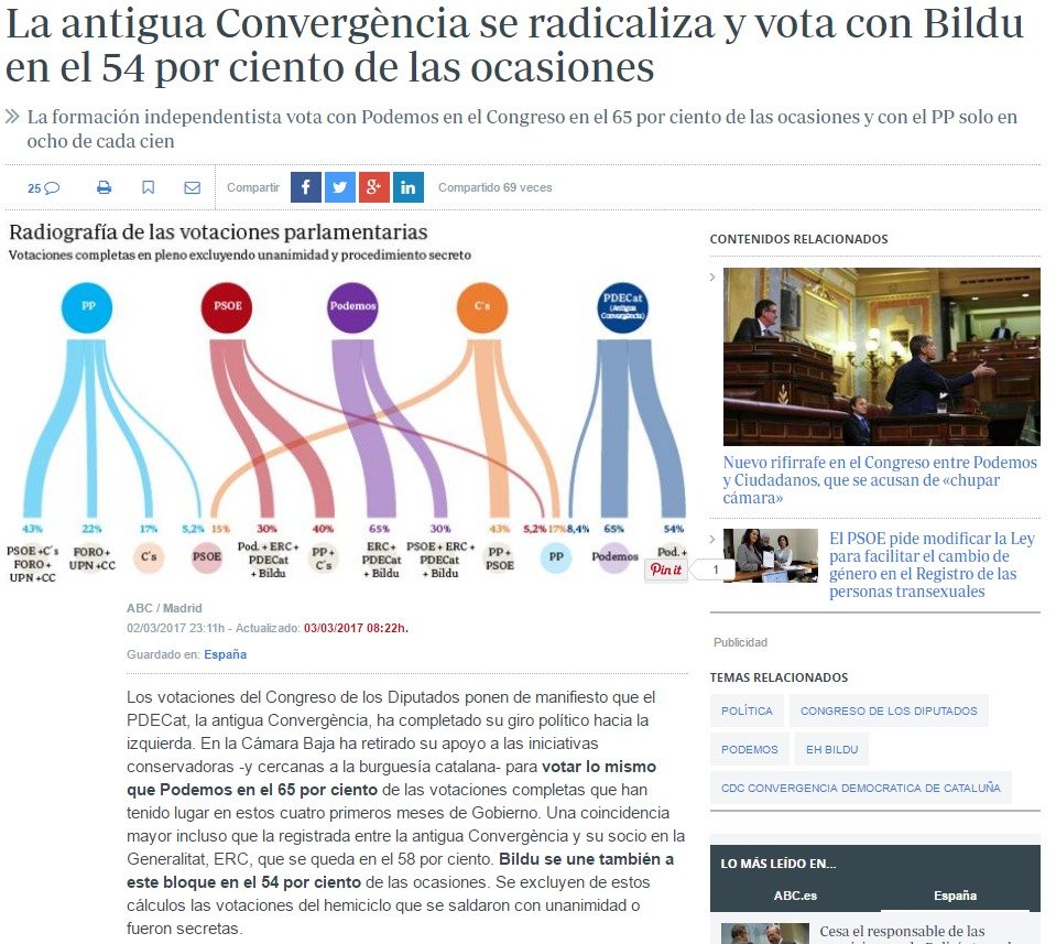 La fijación del relato que equipara el proceso al terrorismo de ETA y del "catalán violento" pide la generación de material cotidiano que recuerde o evoque continuamente esta identidad. Un caso es el el reportaje titulado "La antigua Convergència se radicaliza y vota con Bildu en el 54% de las ocasiones", del pasado día 3. La información, con un gráfico muy interesante, explica que estos cuatro primeros meses de legislatura "el PDeCAT, la antigua Convergència, ha completado su giro político a la izquierda".
