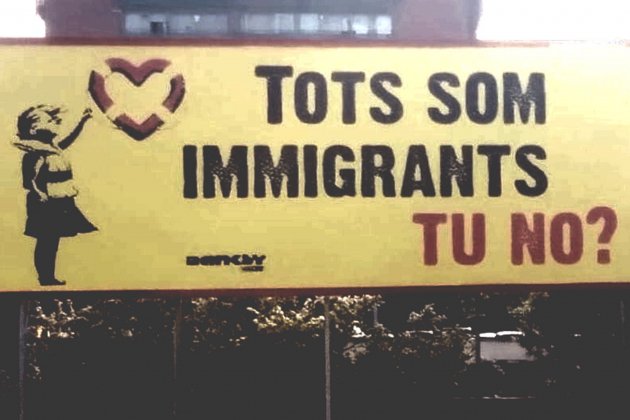 Tardan entre poco y nada en terminar la obra, un grafiti en colores negro y rojo que muestra a una niña cogiendo un flotador salvavidas en forma de corazón. A su lado la leyenda "Tots som immigrants. Tu no?" (Todos somos emigrantes. ¿Tú no?").