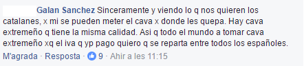 Con todo, suerte de algunos usuarios que sí que se habían leído el artículo, y han puesto negro sobre blanco en la discusión. Y es que no se trata de un cava catalán, sino valenciano, de Requena. Igualmente, también están los que aunque fuera catalán lo comprarían:
