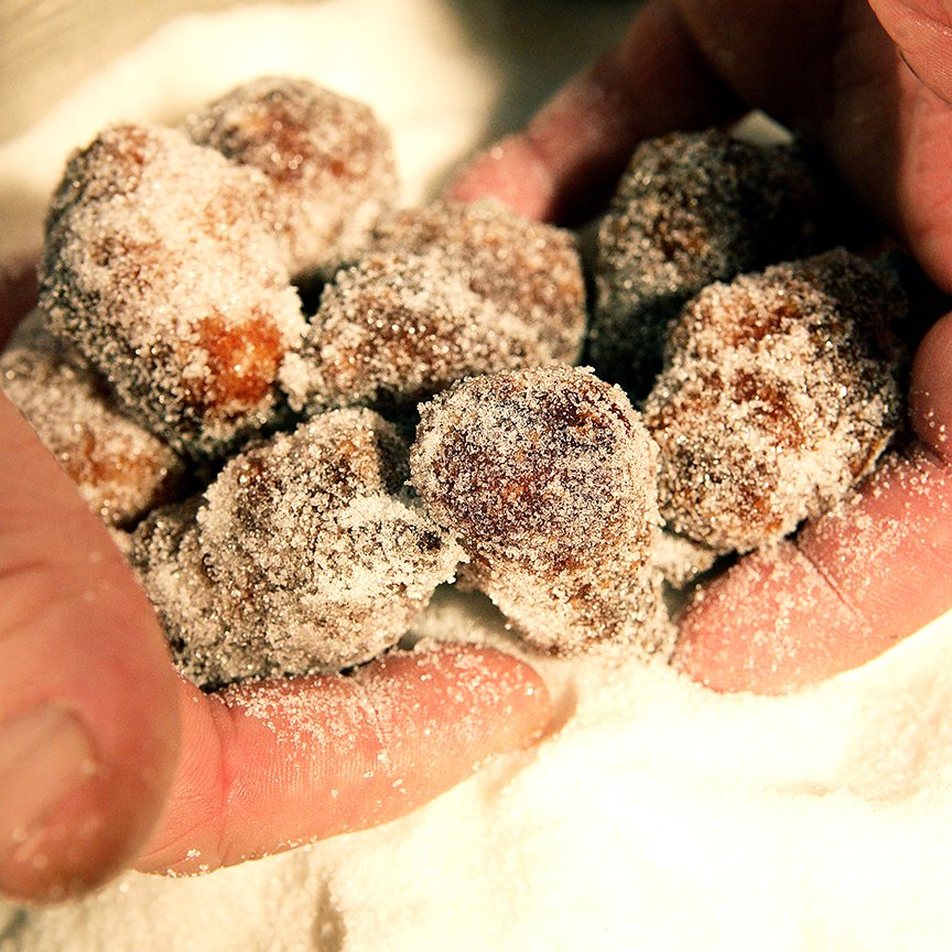 En caliente, reglarlos con un chorrito de anís por encima y a continuación rebozarlos con azúcar.
