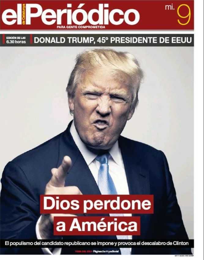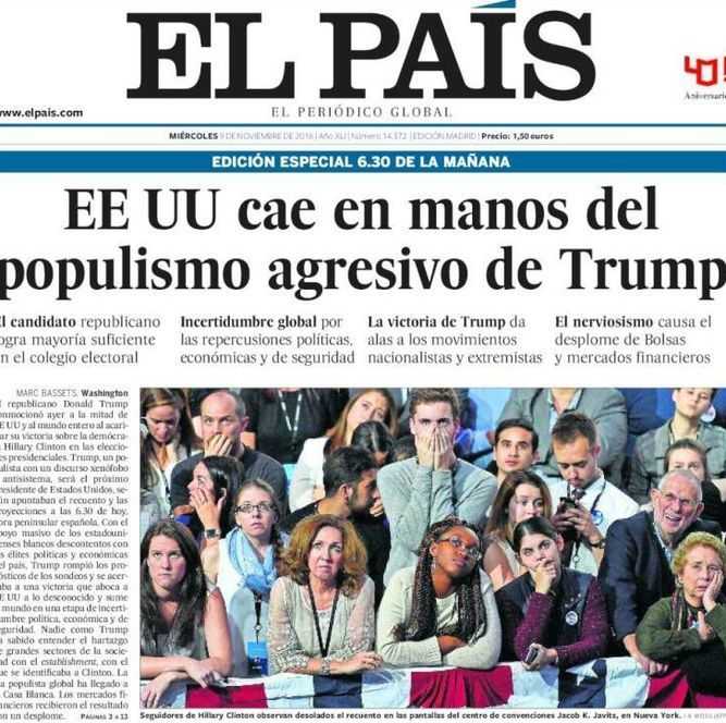 El diario global en español vendía preocupado desde su edición especial de las 6:30 de la madrugada, donde la presidencia no es fruto de una elección democrática limpia y aseada sino que "cae en manos de Trump", lenguaje que hace aparecer al electo como un usurpador y a sus votantes como unos insensatos.