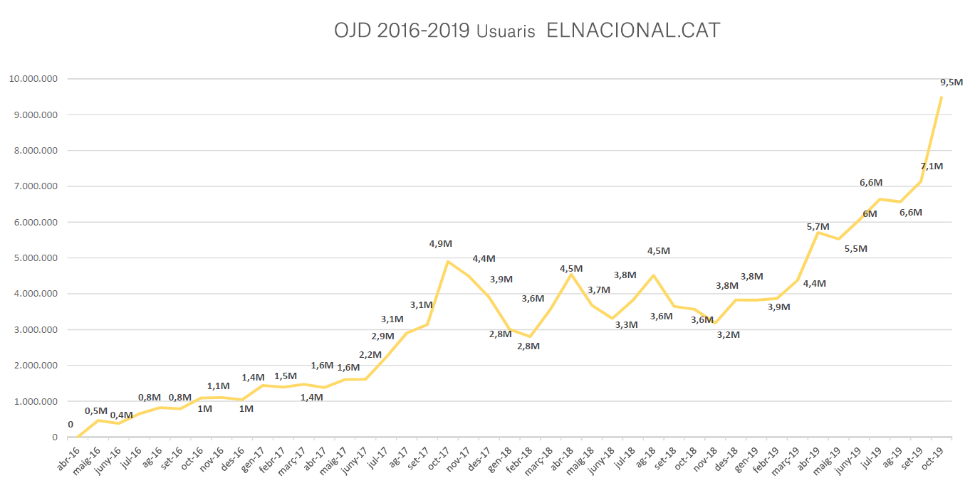 Según estos datos, ElNacional.cat tiene más usuarios únicos mensuales (9,5 millones) que el resto de periódicos digitales catalanes sumados (8,7 millones) auditados por OJD: NacióDigital.cat (3 millones), Ara.cat (2,9), Mon.cat (1,8), ElPuntAvui.cat (1) y la versión digital en catalán de El Periódico (0,7). OJD no audita a la La Vanguardia, El Periódico en castellano ni a VilaWeb. ElNacional.cat sólo pierde la delantera en este parámetro —y por poco— si se añaden las cifras de CrónicaGlobal.es, el digital en castellano editado en Barcelona (2,8 millones de únicos).