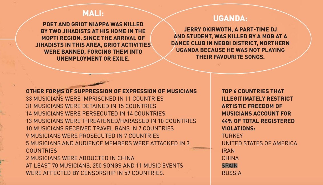Freemuse alerta de que el nacionalismo y el populismo han supuesto un aumento de las restricciones a las expresiones artísticas y destaca el "deterioro importante" en los países donde tradicionalmente se ha protegido este derecho. La música sigue siendo la más censurada, representando el 32% de los casos, pero el arte visual la sigue de cerca con un 26% de los casos.