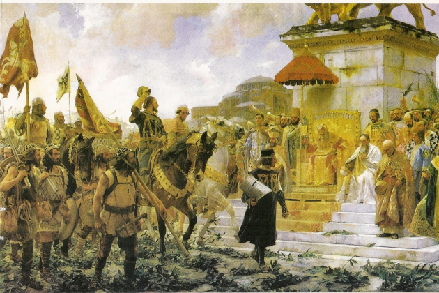 Pintura contemporánea que representa la entrada de Roger de Flor y los almogávares en Constantinopla (1888) / Fuente: Wikimedia