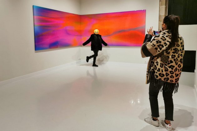 Una visitante haciéndose fotos con gran alegría ante un cuadro abstracto. (A.M.)