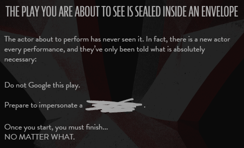 "Un intérprete. Uno obra teatral. Ningún director. Ningún ensayo. Ninguna información". Así definen sus creadores este nuevo estilo de teatro -o de juego de intriga y de misterio-, que tiene una dinámica de funcionamiento bien curiosa. Cada personaje sólo puede pisar una vez por el escenario. ¿Pero, por qué?