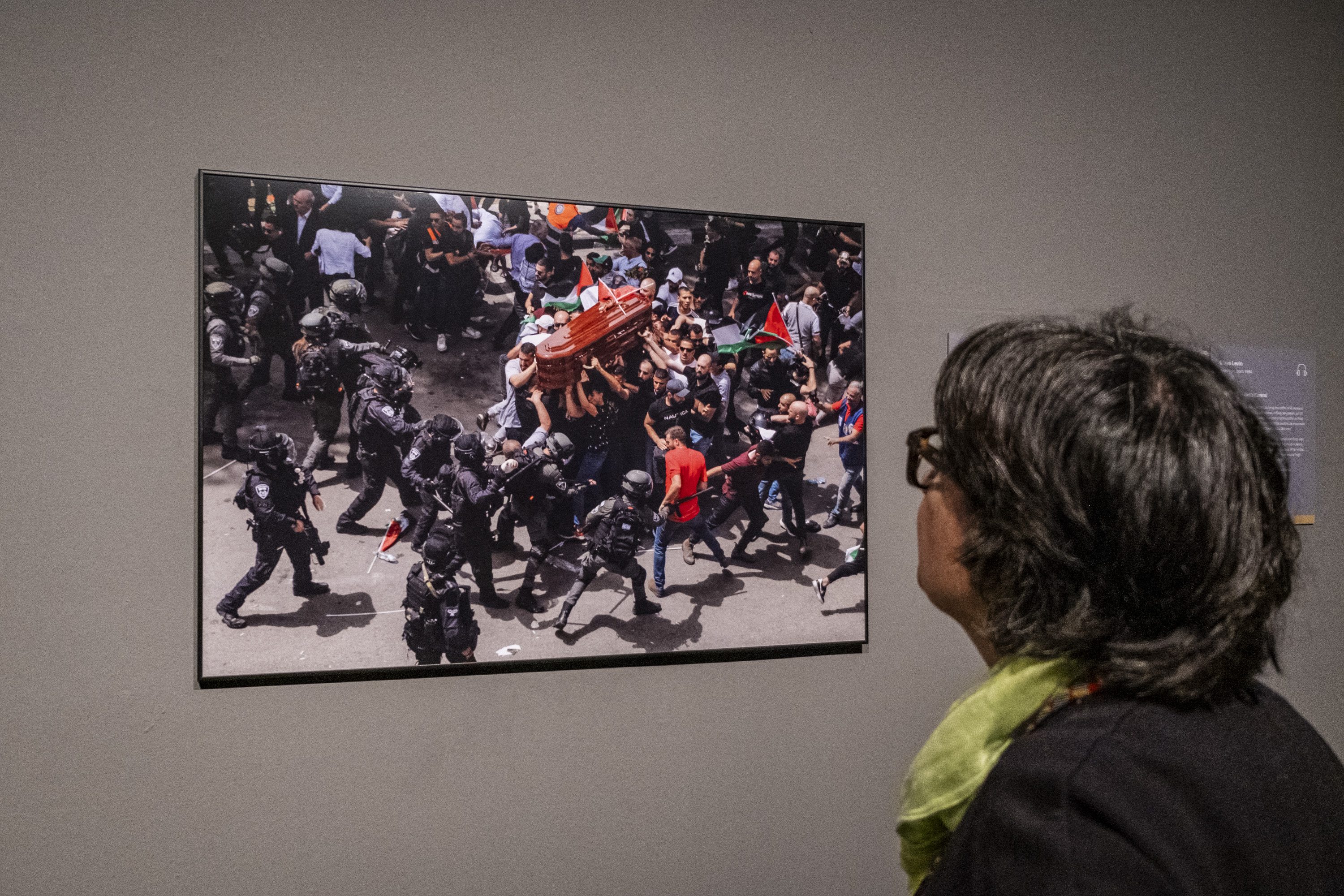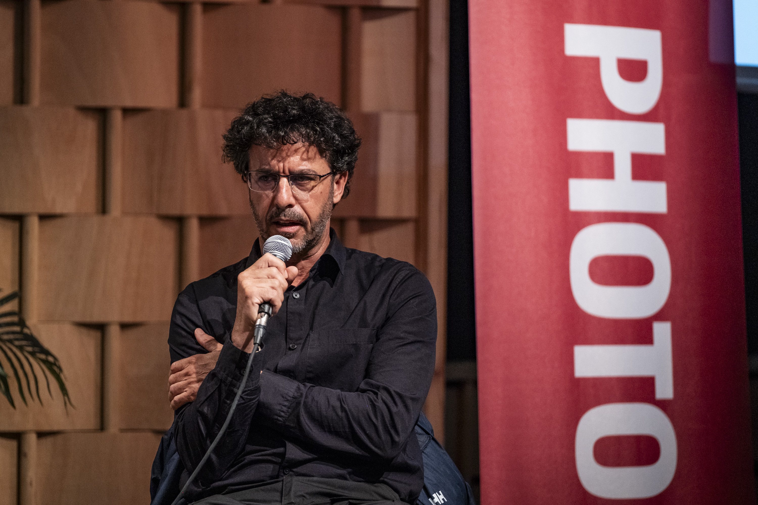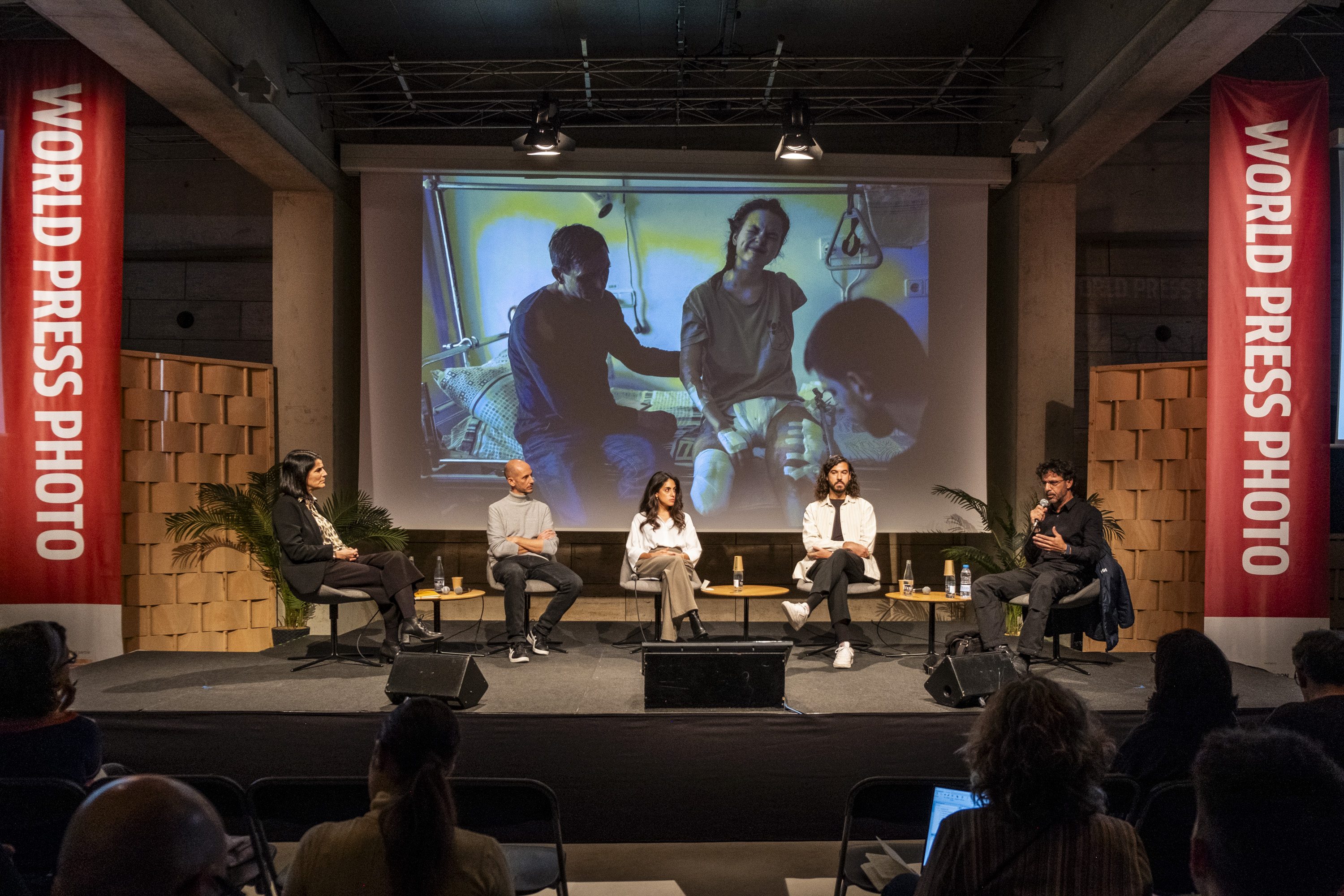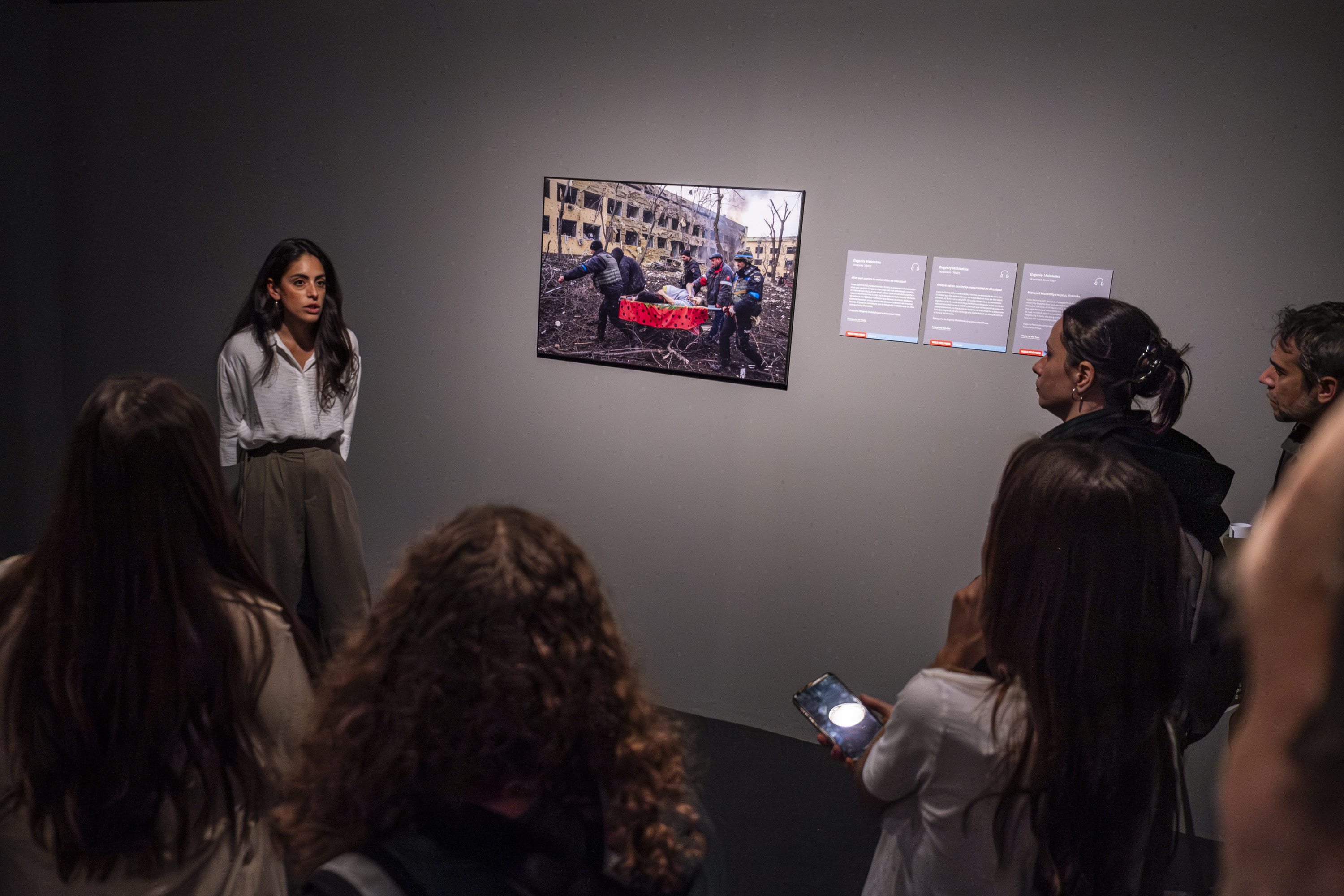 El fotoperiodista Emilio Morenatti, mención de honor del World Press Photo 2023, expone su trabajo durante la presentación. Viajó a Ucrania durante 6 meses y retrató la situación de algunas personas amputadas, en una metáfora a la amputación geográfica del territorio por parte de las fuerzas de ocupación rusas. / Foto: Carlos Baglietto