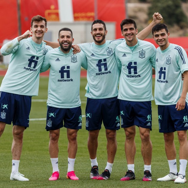 Imagen principal: Llorente, Jordi Alba, Koke Gerard Moreno y Pedri, en un entrenamiento / EFE