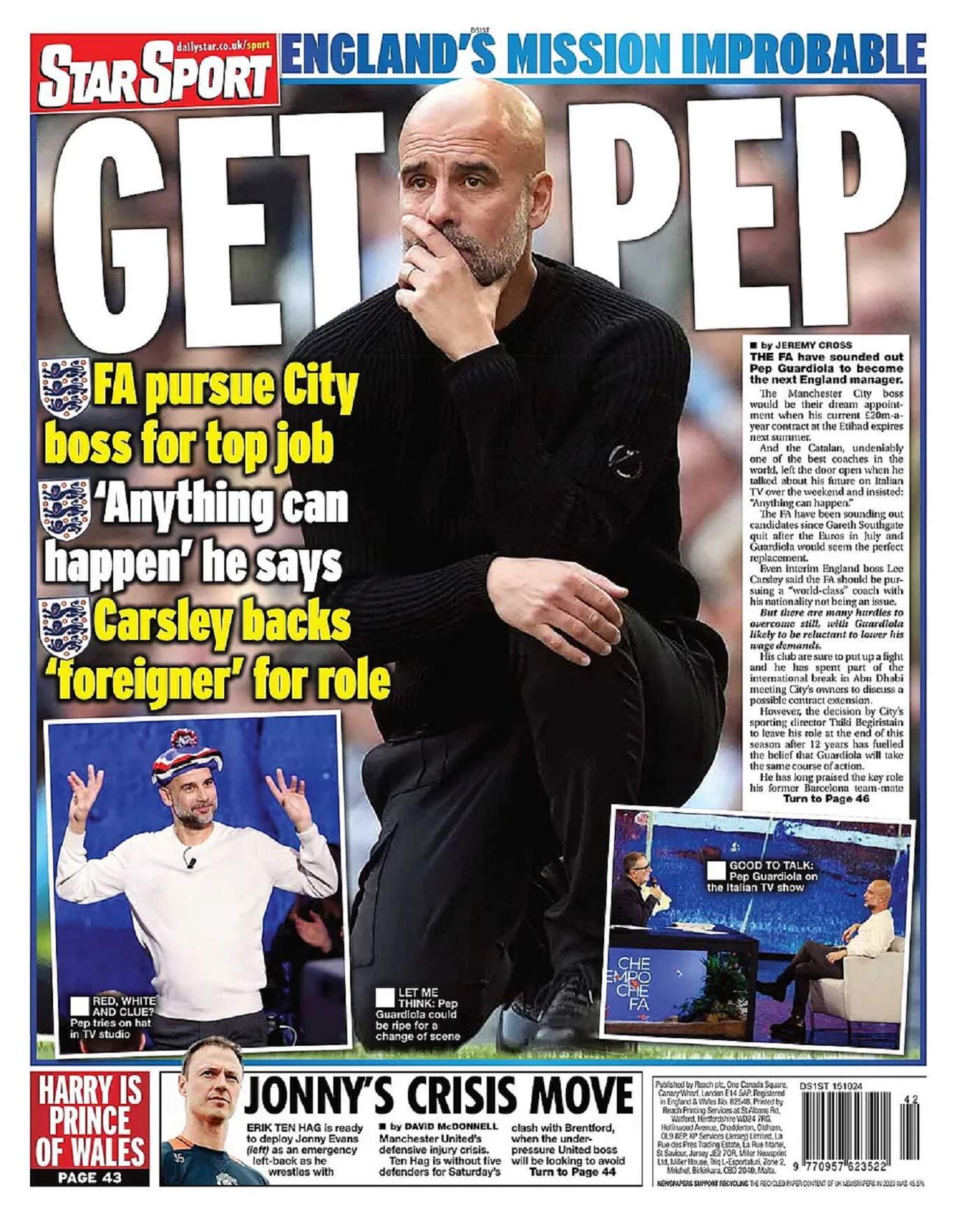 Mucho más directo es Star Sport: "Coged a Pep". "La FA lo persigue para el trabajo" y Lee Carsney "avala el extranjero para el rol". El caso es que Inglaterra, salvo el sueco Sven-Göran Eriksson entre 2001 y 2006 y el italiano Fabio Capello entre 2008 y 2012, siempre ha tenido seleccionadores ingleses. Si Pep Guardiola acaba erigiéndose en el elegido, será el tercer entrenador no nacional de la historia de los Three Lions.