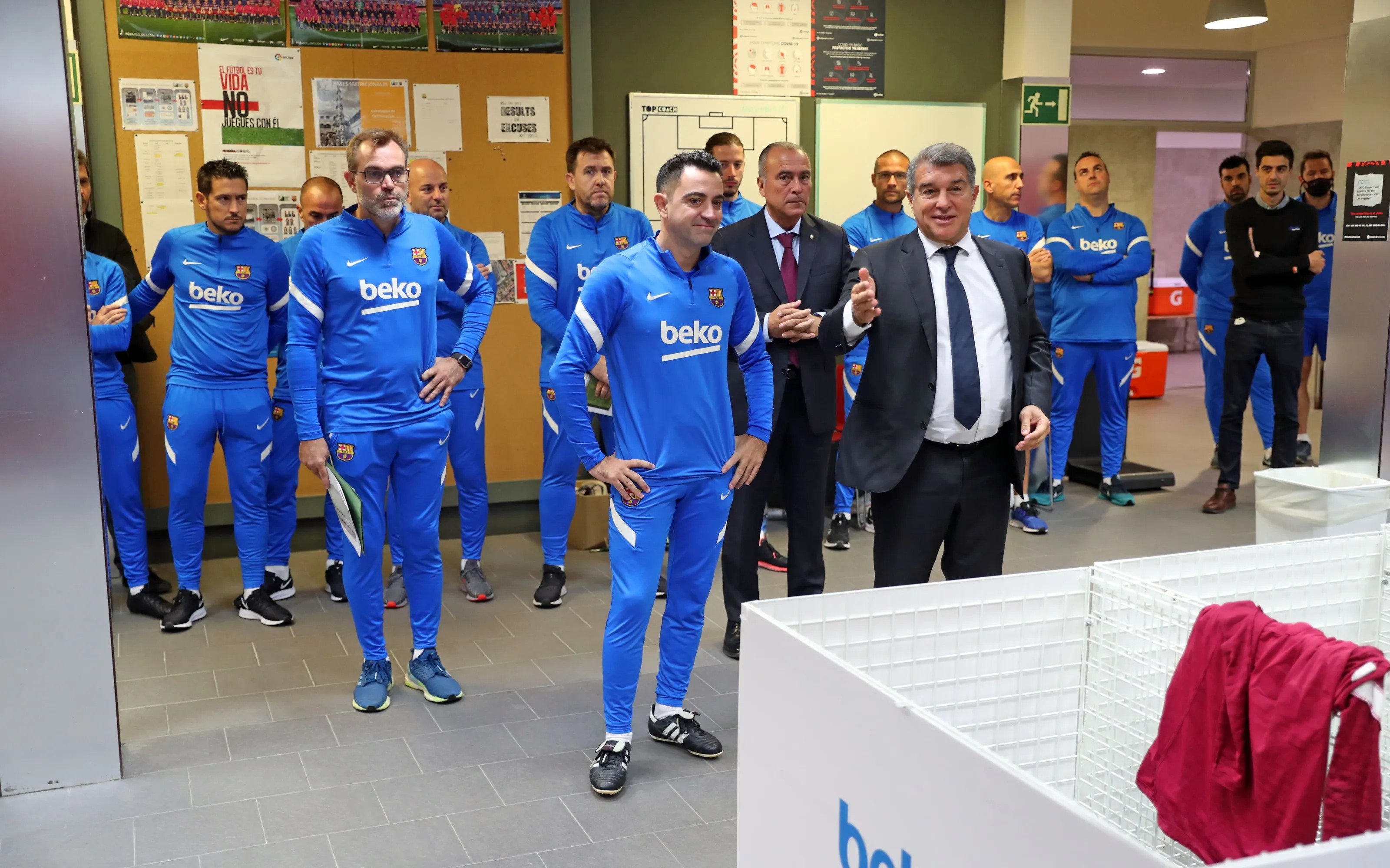 Imagen principal: Joan Laporta hablando a los jugadores del Barça al lado de Xavi Hernández / FC Barcelona