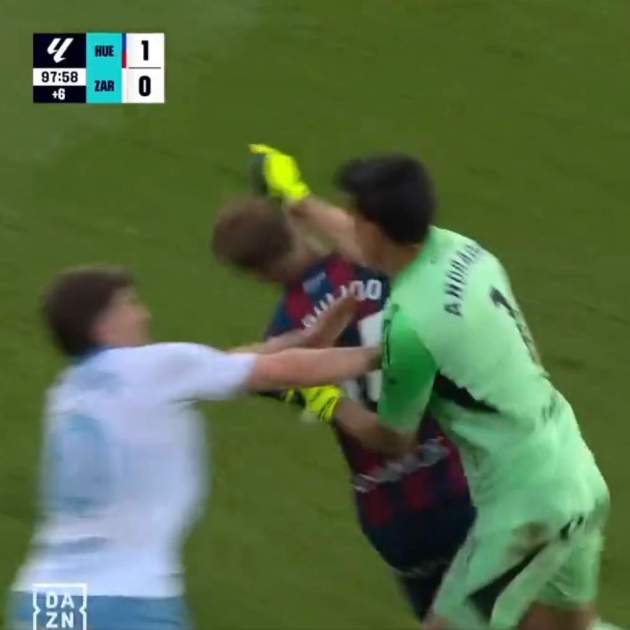 Todo ello ha desembocado, lógicamente, en una tangana entre los dos equipos. La acción ha sido muy dura y es un hecho que no se puede ver en un terreno de juego. Ahora habrá que esperar qué sanción se le impone a Andrada, pero todo indica que será importante y que tendrá que pagar las consecuencias de lo que ha pasado. No parece que pueda volver a jugar esta temporada. El árbitro, además, también ha expulsado a Dani Jiménez, portero del Huesca, por agredir a Andrada durante la tangana. Y también Tasende, por la acción que había ido a revisar al VAR y que ha acabado desencadenando toda la pelea. Un final de partido muy tenso y con una imagen que perjudica gravemente al Zaragoza y al fútbol en general.