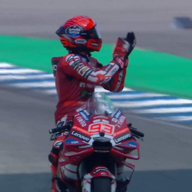 Al menos durante la carrera sobre el trazado Tailandés. La cosa ha cambiado una vez terminada la carrera, ya con Pedro Acosta victorioso. La primera reacción del catalán ha sido aplaudir de forma irónica la sanción que había recibido. Una vez llegado a la zona de boxes, se ha visto a un Márquez contrariado. Es normal, tenía la victoria a tocar y se le ha acabado escapando de una forma poco habitual. Con quien primero ha conversado ha sido Gigi Dall'Igna, el jefe de Ducati, que tampoco ha terminado nada contento después de haber desaprovechado la oportunidad de arrancar el Mundial tal como había terminado el anterior: con Márquez como líder.