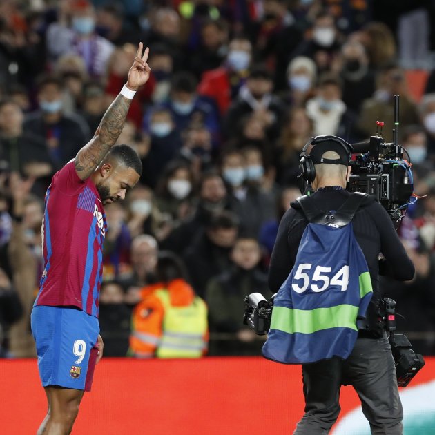 Imagen principal: Memphis Depay celebrando un gol con el Barça / EFE