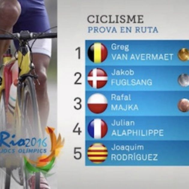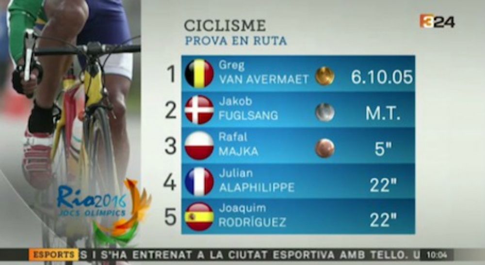 Una imagen del Telenotícies de TV3 ha desatado otro polémico capítulo. Los deportes del canal utilizaron una infografía para ilustrar los resultados de la prueba de ciclismo en ruta de los Juegos Olímpicos de Rio. En ella, aparece el ciclista catalán Joaquim 'Purito' Rodríguez, quinto, identificado con la senyera en lugar de la bandera española.