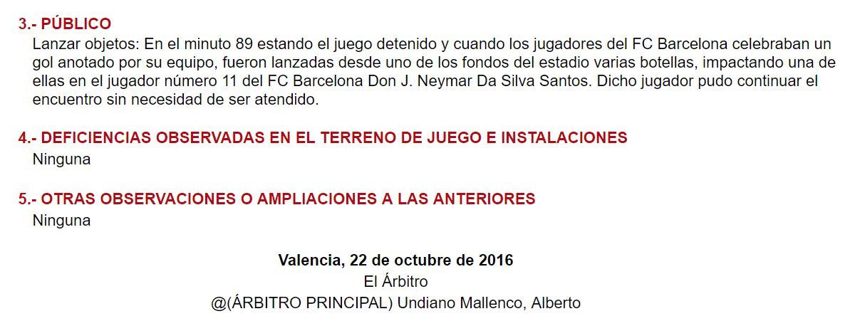 El árbitro del partido, Alberto Undiano Mallenco, dejó constancia de los hechos en el acta arbitral. El problema fue un lanzamiento de objetos por parte del público. Se explica que durante la celebración "fueron lanzadas varías botellas" y una de ellas acabó impactando con Neymar.