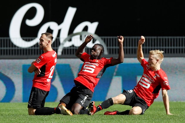 Celebración de gol del Rennes.