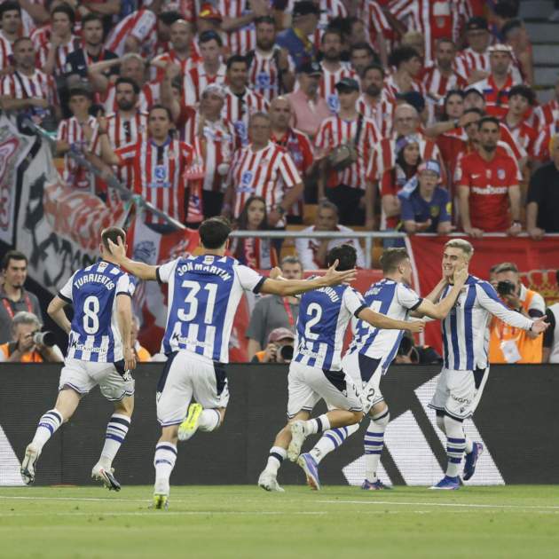 La Real Sociedad se impone al Atlético de Madrid en los penaltis y se lleva la Copa del Rey. Los vascos se han adelantado con un gol de Barrenetxea y, después, Lookman ha empatado. De penalti, Oyarzabal ha hecho el 1-2. Cuando faltaba muy poco, Julián Álvarez, con un golazo, ha enviado el partido a la prórroga (2-2). En esta, nadie ha marcado y la final se ha decidido en los penaltis. Aquí, Marrero, portero de la Real, se ha vestido de héroe y ha parado dos (3-4). De esta manera, los txuri-urdin tocan el cielo de La Cartuja y ganan la cuarta Copa del Rey de su historia.
