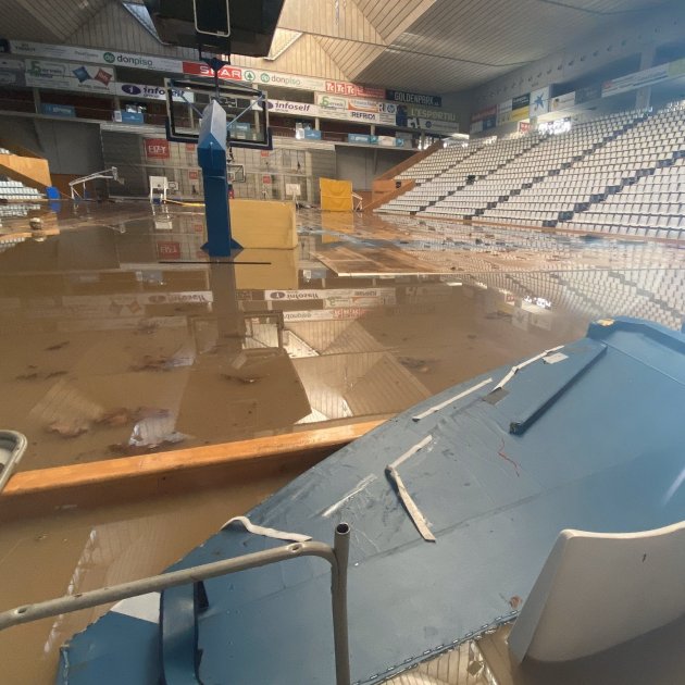 El Gloria acabó inundando el pabellón de Fontajau, sede del Uni Girona. Unas imágenes que impactan de una pista de baloncesto llena de agua, con más metro de agua en las oficinas.