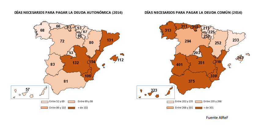 En este sentido, otro resultado interesante del estudio que pretende "difundir los beneficios de la sostenibilidad de las cuentas públicas" es que los madrileños y los vascos son los que menos días tendrían que estar sin cobrar para poder limpiar la deuda autonómica y común.