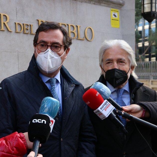 Foto principal: El presidente de la CEOE, Antonio Garamendi, y el vicepresidente de CEOE y presidente de Foment del Treball, Josep Sánchez Llibre, delante de la sede del Defensor del Pueblo en Madrid este miércoles. / ACN