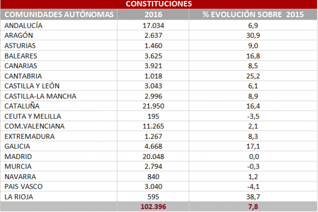 Más concretamente, en Catalunya se han creado el 21,4% de las nuevas sociedades del conjunto de España y junto a la Comunidad de Madrid, esta cuota logra alcanzar el 41%. En gran parte consecuencia de ello, la creación de nuevas sociedad en España ha aumentado un 7,8% respecto a 2016 hasta alcanzar las 102.396 compañías. A pesar de encontrarse todavía lejos del máximo histórico de 2006 donde se constituyeron casi 150.000 nuevas empresas, cabe destacar que desde 2008 que no se superaba la barrera de los 100.000.