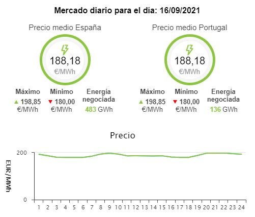 Por franjas horarias, el precio más alto de este jueves se registrará entre las 21.00 y las 22.00 horas, momento en el cual llegará a los 198,85 euros. El más bajo, de 180 euros, se pagará entre las 03.00 y las 06.00 y entre las 16.00 y las 18.00 horas.