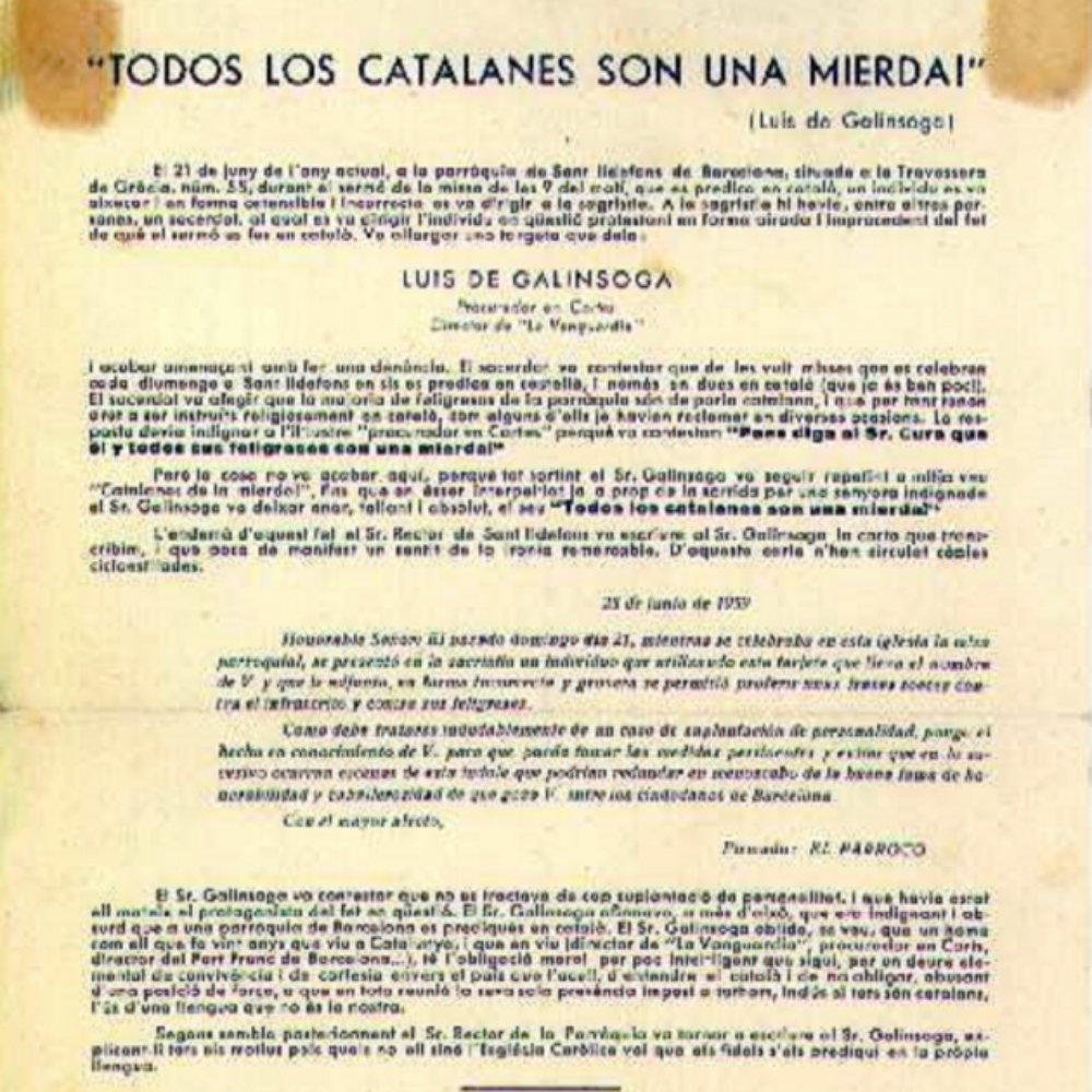 Galinsoga saltó a primera plana de la actualidad el 21/06/1959, cuando ya hacía veinte años que era, simultáneamente, director de La Vanguardia Española y diputado en las Corts franquistas. Después de asistir a una misa dominical que se había oficiado en catalán —en una parroquia de la zona alta de Barcelona— dejó una nota en la sacristía que decía textualmente "Todos los catalanes son una mierda". Tanto el rector como el obispado intentaron resolver aquel incidente de forma amistosa y discreta. Pero Galinsoga, convencido de su fuerza, no solo se ratificaría, sino que —desde su atalaya de poder— contribuiría a divulgar aquel incidente.