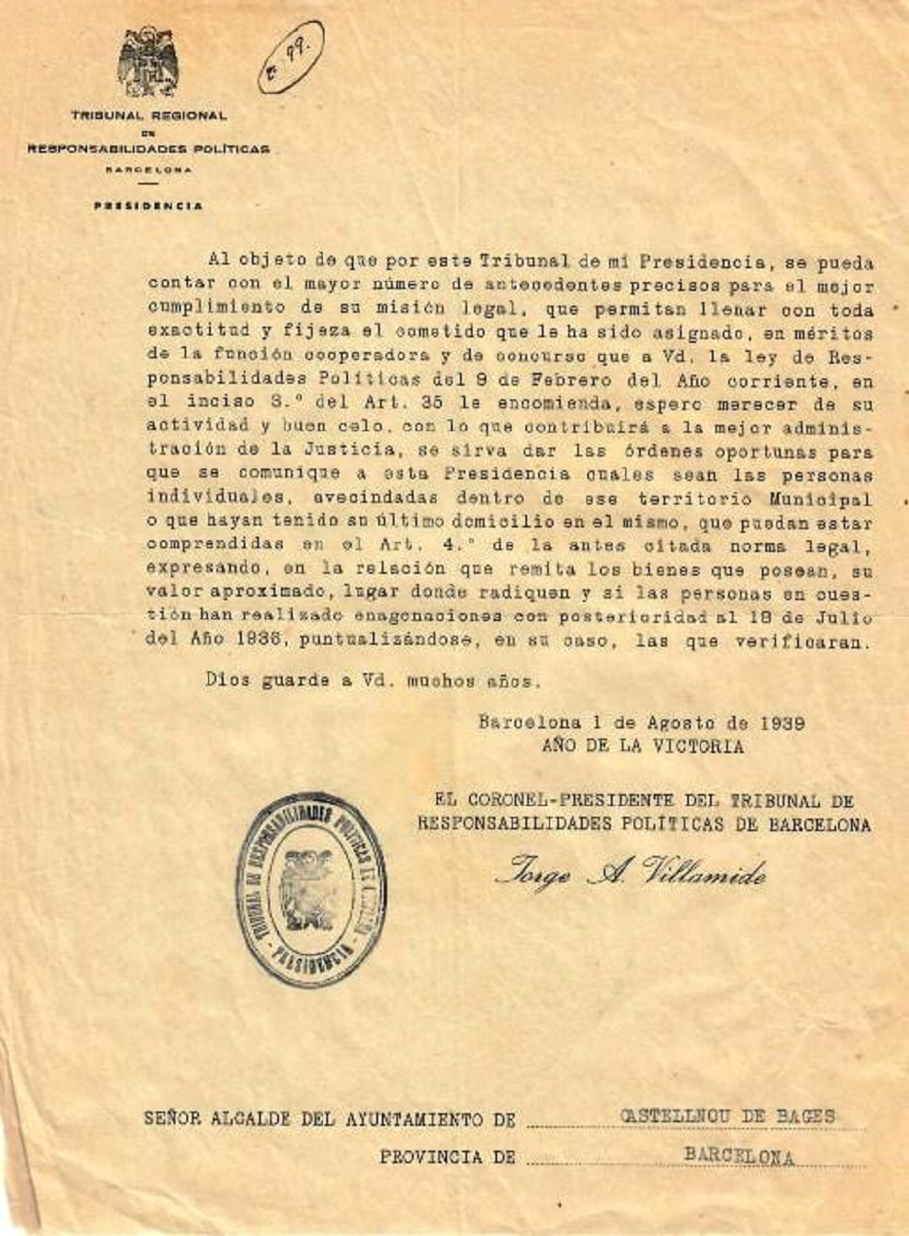 Tal día como hoy del año 1939, hace 80 años, en el contexto de los meses inmediatamente posteriores a la ocupación franquista de Catalunya y de la conclusión de la Guerra Civil española (1936-1939), la prensa de la época (La Vanguardia Española, edición del 12/08/1939), publicaba que el Tribunal Regional de Responsabilidades Políticas —en Barcelona —, dirigido por el coronel Jorge A. Villamide Salinero, publicaba un edicto que ordenaba a toda la población de Catalunya delatar a las personas de ideología catalanista y republicana que tenían propiedades a su nombre.