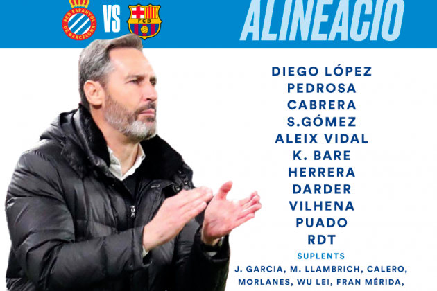 Diego López; Pedrosa, Cabrera, Sergi Gómez, Aleix Vidal; Keidi Bare, Herrera, Darder, Vilhena, Puado; RDT